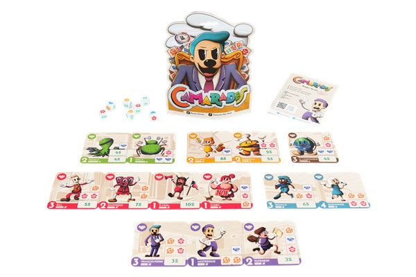 Camarades est la réédition d’un classique du Dr Reiner Knizia : Risk Express (aussi connu sous le nom de Age of War). Il est possible d’ajouter du piment à vos parties avec l’extension “La bombe”, fournie avec la piste de dés unique et inédite, spéciale Camarades.